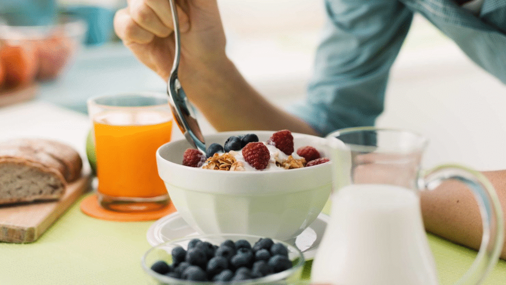 A wholegrain lower sugar cereal with semi-skimmed milk and fruit sliced over the top is a tasty and healthier breakfast.