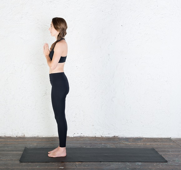 Starting position: Stand straight, with spine erect and shoulders relaxed. Your feet are hip-width apart. Your knees are straight but not hyper-extended; your arms are relaxed next to your body.