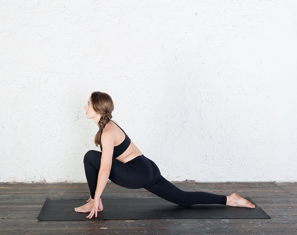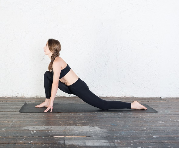 – Drop your left knee to the floor, point your left foot, and push your pelvis forward and toward your right heel.