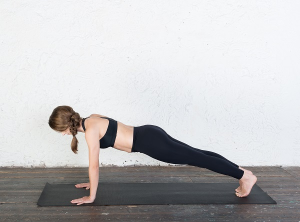– Without moving your hands or feet, push your hips toward the ceiling.