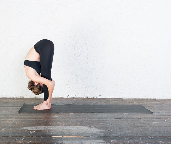 3. Breathe out and bend forward, placing your palms on the floor, outside of your feet.